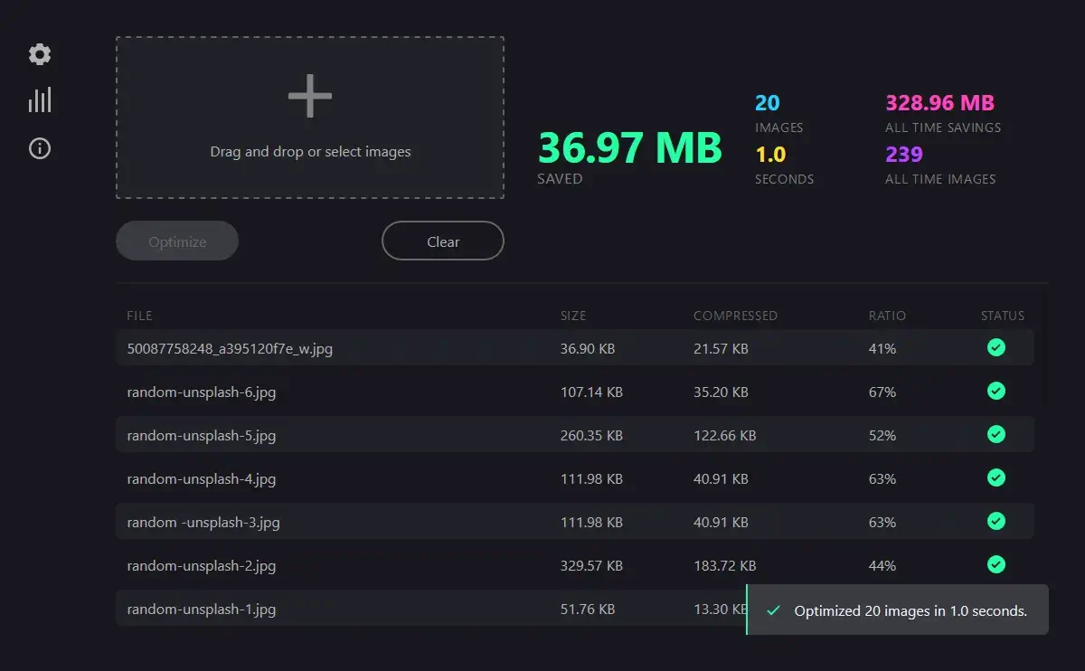 CommunityShowcase옵티머스(Optimus)버전: v2.8.1옵티머스(Optimus)Optimus 데스크탑 이미지 최적화 애플리케이션입니다. WebP, JPEG, PNG 이미지 포맷 형식간의 변환 및 압축을 지원합니다.